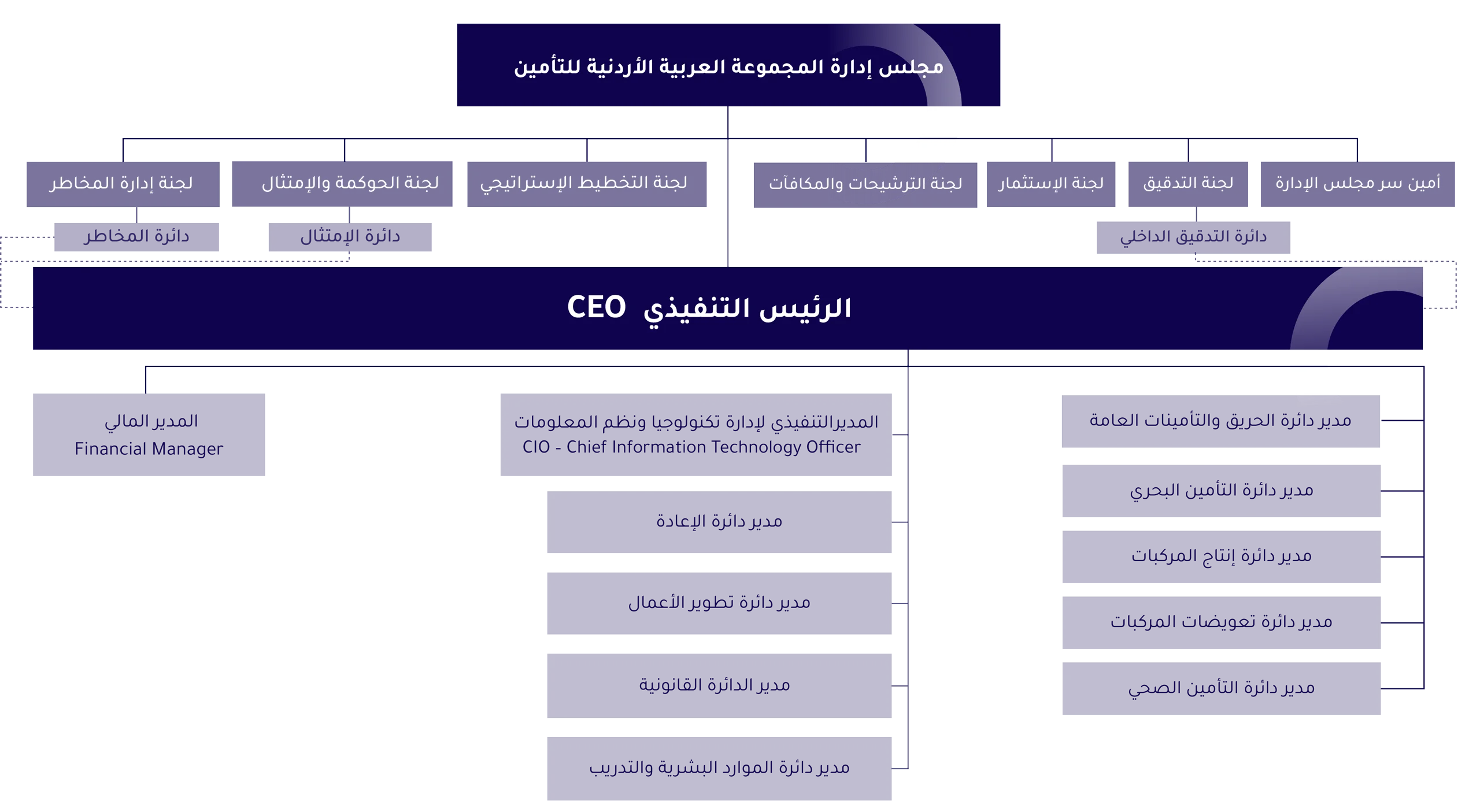 تعتمد AJIG هيكلًا تنظيميًا مؤسسيًا يضمن وضوح الصلاحيات، وسلاسة اتخاذ القرار، وتكامل الأدوار بين الإدارات المختلفة، بما يدعم تحقيق الأهداف الاستراتيجية ويرتقي بجودة الخدمات.
